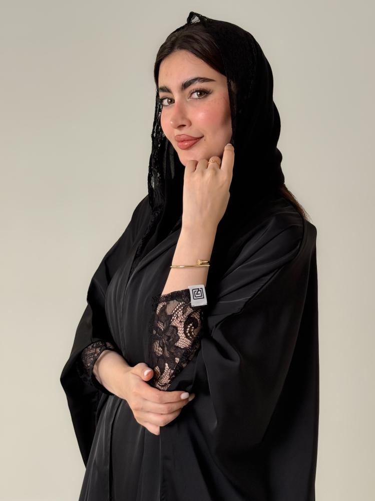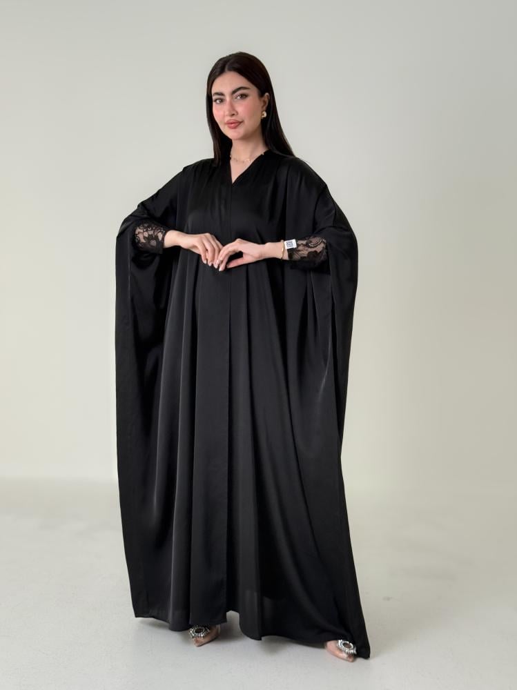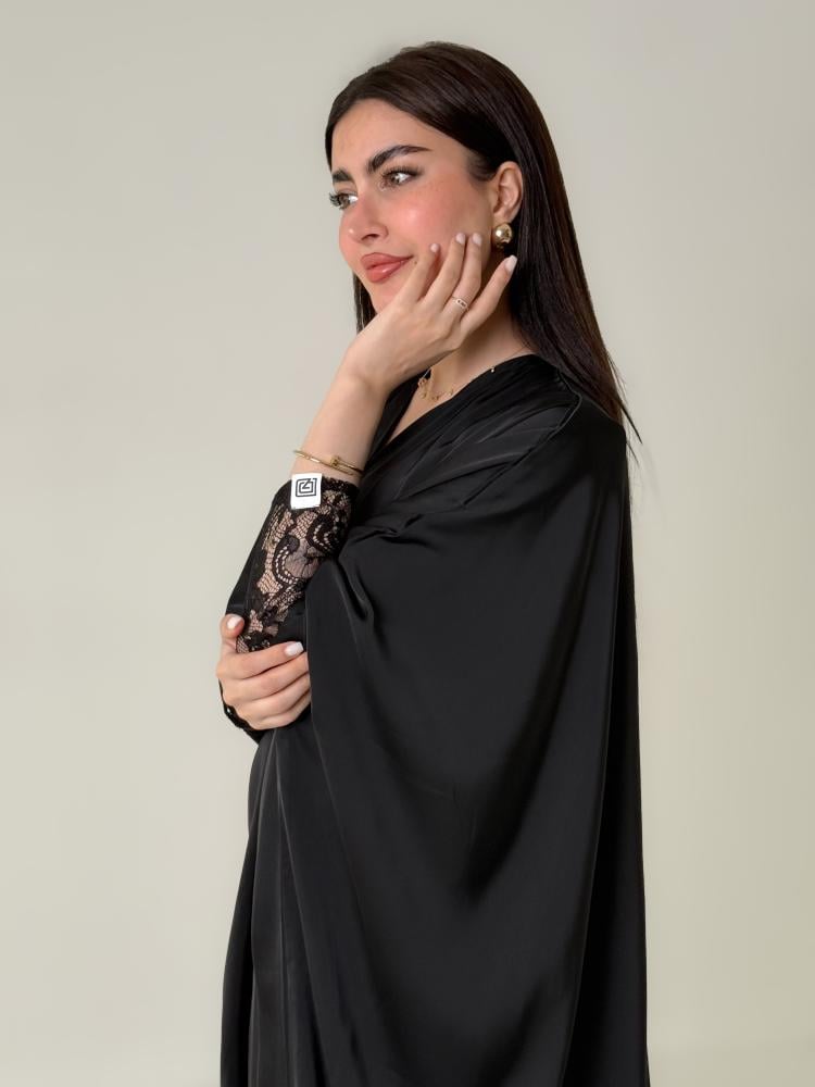 عباية حرير اسود مع تدخيلة دانتيل في الاكمام نص بشت